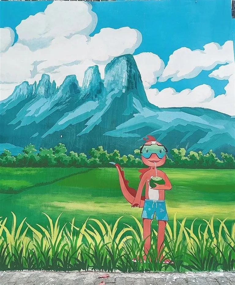 椰林下,,,,,,,憨态可掬的“红丹丹”弹奏着吉他;;;;;;;;蹊径另一侧,,,,,,,游客头戴遮阳帽,,,,,,,愜意地闲步在阳光海滩上……借助画笔,,,,,,,一幅幅构想巧妙、色彩壮丽的彩绘跃然于各个街角。。。。。。