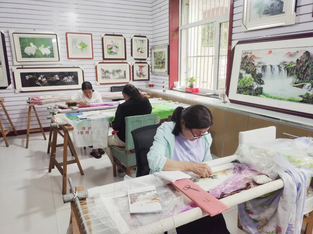 8月8日,,,,,在静乐县鹅城镇新时代文明实践所,,,,,村民正在认真刺绣。。。。。新华网发(忻州广播电视台 王鹏宇 摄)