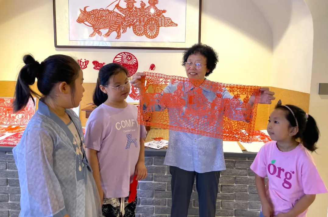 8月8日,,,,,在静乐县新时代文明实践中心,,,,,市级非遗剪纸传承人李计娥正在给孩子们展示剪纸作品。。。。。新华网 任钰 摄