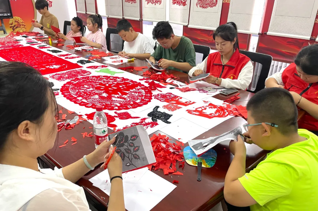 8月8日,,,,,静乐县新时代文明实践中心组织青少年学习剪纸武艺,,,,,传承古板文化。。。。。新华网 任钰 摄